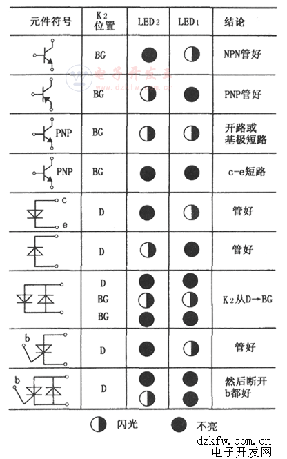 接通電源,不插器件(管子),若發光二極管LED1、LED2交替發光,則說明測試信號源是正常的。在管子插入,即在線的情況下,能快速指示被測二極管、三極管的好壞和判別管子的極性,測試條件、LED1與LED2閃亮情況和測試結果如下表所示。