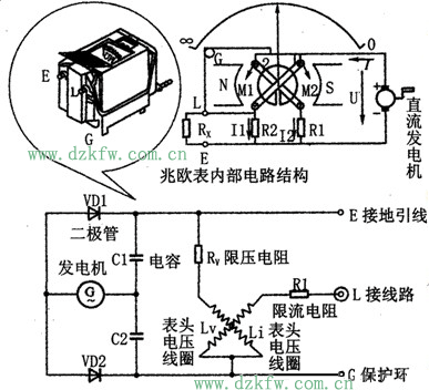 與搖表表針相連的有兩個線圈,一個同表內的附加電阻R串聯;另一個和被測電阻R串聯,然后一起接到手搖發電機上。當手搖動發電機時,兩個線圈中同時有電流通過,在兩個線圈上產生方向相反的轉矩,表針就隨著兩個轉矩的合成轉矩的大小而偏轉某一角度,這個偏轉角度決定于兩個電流的比值,附加電阻是不變的,所以電流值僅取決于待測電阻的大小。