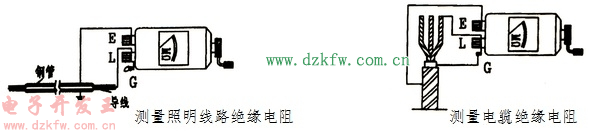 搖表(兆歐表)有三個測量端鈕,一個線路端鈕(L),另一個是接地端鈕(E),還有一個為屏蔽端鈕(G)。一般測量照片或電力線路對地的絕緣電阻時,只用L和E端,接線如下左圖所示。“L”端接到被測設備的“火”或“相端”,“E”端接到被測設備的“地”端。在測量電纜對地絕緣電阻時或被測設備的漏電流嚴重時,使用“G”端鈕。如下右圖所示為測量電纜絕緣電阻接線圖。
