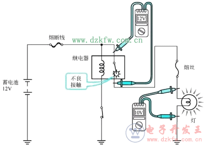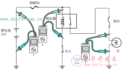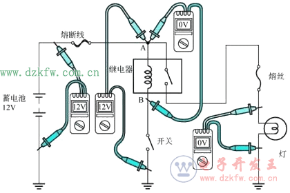 通常情況下,僅從外觀觀察很難發現電氣系統內存在故障點,所以了解電路的電壓以便發現故障是非常重要的。下面用幾個萬用表測量的示意圖說明問題。
