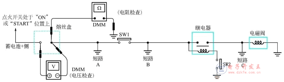 ① 拆下燒壞的熔絲并斷開所有通過熔絲電源的負載(即SW1 斷開,繼電器及電磁閥斷開)。