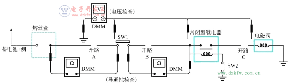 ④ 閉合SW1,在繼電器處測試。有電壓,開路在繼電器之后更遠處;無電壓,開路在SW1 和繼電器之間(點B)。