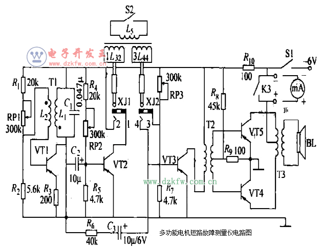 這里介紹的電機短路測量儀,不但能用來迅速準確地檢查電動機、發電機電樞單匝以上的短路故障,還能用來檢查籠型轉子鑄鋁質量及導體中是否有斷條故障。利用這個測量儀,在重繞電機繞組時,可以一邊下線一邊測試,避免操作不慎而造成短路,如圖5 26所示。晶體管VT1.變壓器T等組成變壓器反饋振蕩電路,產生約2000Hz的音頻信號。VT2等組成音頻放大器。音頻放大器產生的音頻振蕩信號經VT2放大后加到ld繞阻上。當S2合上時,厶繞組形成閉合回路,音頻信號電壓經L3、L、k的互相耦合加到了VT3的基極,經兩級音頻放大后,推動揚聲器或者由電表指示出來。