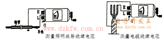 搖表(兆歐表)有三個(gè)測(cè)量端鈕,一個(gè)線路端鈕(L),另一個(gè)是接地端鈕(E),還有一個(gè)為屏蔽端鈕(G)。一般測(cè)量照片或電力線路對(duì)地的絕緣電阻時(shí),只用L和E端,接線如下左圖所示。“L”端接到被測(cè)設(shè)備的“火”或“相端”,“E”端接到被測(cè)設(shè)備的“地”端。在測(cè)量電纜對(duì)地絕緣電阻時(shí)或被測(cè)設(shè)備的漏電流嚴(yán)重時(shí),使用“G”端鈕。如下右圖所示為測(cè)量電纜絕緣電阻接線圖。
