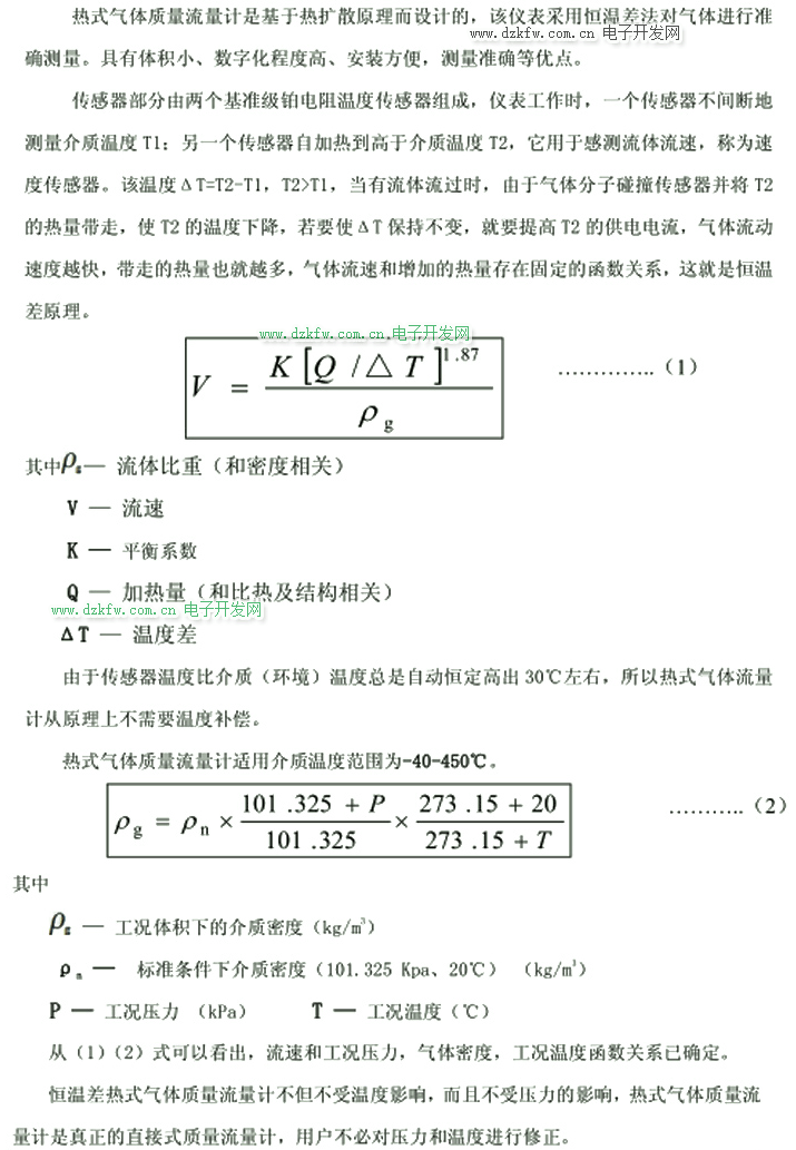 熱式氣體質量流量計是氣體流量計量中新型儀表,區別于其它氣體流量計不需要進行壓力和溫度修正,直接測量氣體的質量流量,一支傳感器可以做到量程從極低到高量程。它適合單一氣體和固定比例多組份氣體的測量。它依據的原理是流體吸收熱的速度直接與質量流量相關。移動的氣體分子撞擊熱電阻時吸收帶走熱量,流率越大,接觸熱電阻的分子越多,吸收的熱量越多,熱吸收與某種氣體的分子數,熱學特性和流動特性有關。