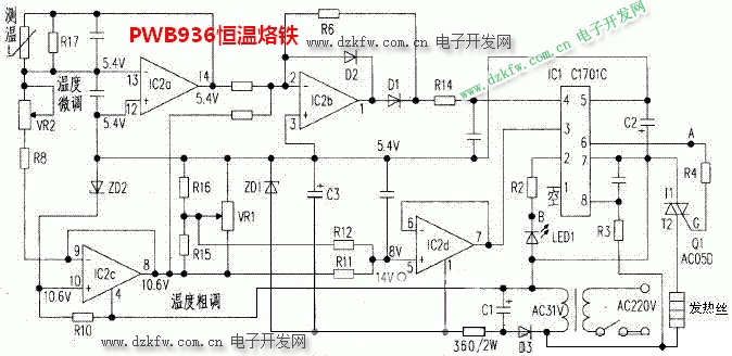 市面上其他936焊臺的電路圖大體類似,都是采用LM358比較器進行溫度恒溫反饋控制的。電烙鐵電路圖如下: