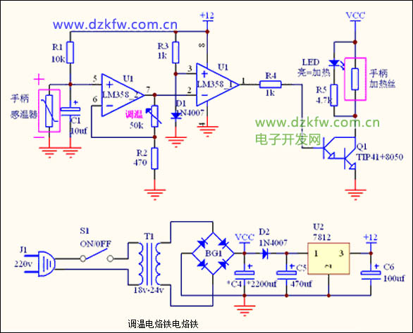 Rx上的電壓被第一個 LM358放大,放大倍數由微調電阻 VR2控制。再進入第二個 LM358進行電壓比較。 ZD2和 ZD4之間提供設定電壓,由電位器 W控制。我們通過調節 W,來設定焊臺的溫度。溫度低時, Rx 上電壓不高,第二個 LM358輸出為負電壓, Q2導通, BT137 導通,對芯加熱。達到設定溫度時,第二個 LM358輸出為正電壓, Q2截止,BT1 37 截止,停止加熱。注意,這里 ZD2和 ZD1給 LM358提供正負電壓,相當于是雙電壓供電, ZD2 的正極可認為是零點。 R8的作用是:觸發 BT137導通。C2上的電壓通過 R8、BT137的 T1 端、BT13 7 的 G端、Q2、R17,再回到 C2,這樣使 BT137控制端 G導通,從而 BT137的 T2、 T1端得以導通。