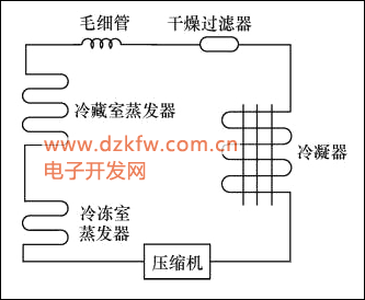 普通電冰箱因多采用往復式壓縮機,所以它的制冷系統由壓縮機、冷凝器、干燥過濾器、毛細管、蒸發器構成
