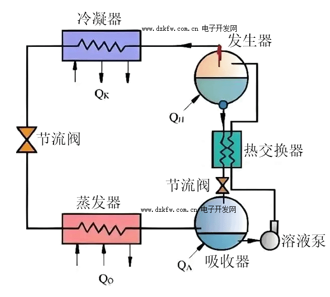 吸收式制冷利用吸收劑對制冷劑氣體的吸收和釋放來實現制冷循環。這種制冷技術不需要壓縮機,因此運行平穩、噪音低。但其缺點是制冷效率相對較低,且設備復雜、成本較高。吸收式制冷系統包括制冷劑回路和溶液回路兩個回路。制冷劑回路中,高壓制冷劑氣體在冷凝器中冷凝成液體,經節流后進入蒸發器蒸發制冷。溶液回路中,吸收劑吸收來自蒸發器的低壓制冷劑蒸氣,形成富含制冷劑的溶液。溶液經加熱后釋放出制冷劑氣體,重新進入制冷劑回路。
