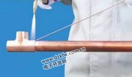 注意:焊接時(shí),銅管的溫度足夠熔化銀焊條;火焰不能直接加熱銀焊條,否則溫度過高,熔化的銀焊條會(huì)流走,焊接口難已填滿,出現(xiàn)虛焊或砂眼!