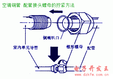 在管接頭擰緊前,必須將室內機組的作過保溫處理的排水軟管、氣體接管、液體接管和電纜穿入導管中。然后插人墻孔與室外機組對應的管道相連并擰緊。銅管的接駁和彎曲采用專用的外購銅套管接頭和90度彎頭,一律采用釬焊(銀焊)焊接。注意不得有灰塵,雜物和水份帶入管內。