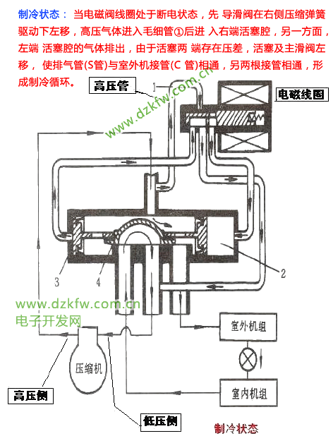 空調制冷狀態: 當電磁閥線圈處于斷電狀態,先 導滑閥在右側壓縮彈簧驅動下左 移,高壓氣體進入毛細管①后進 入右端活塞腔,另一方面,左端 活塞腔的氣體排出,由于活塞兩 端存在壓差,活塞及主滑閥左移, 使排氣管(S管)與室外機接管(C 管)相通,另兩根接管相通,形 成制冷循環。