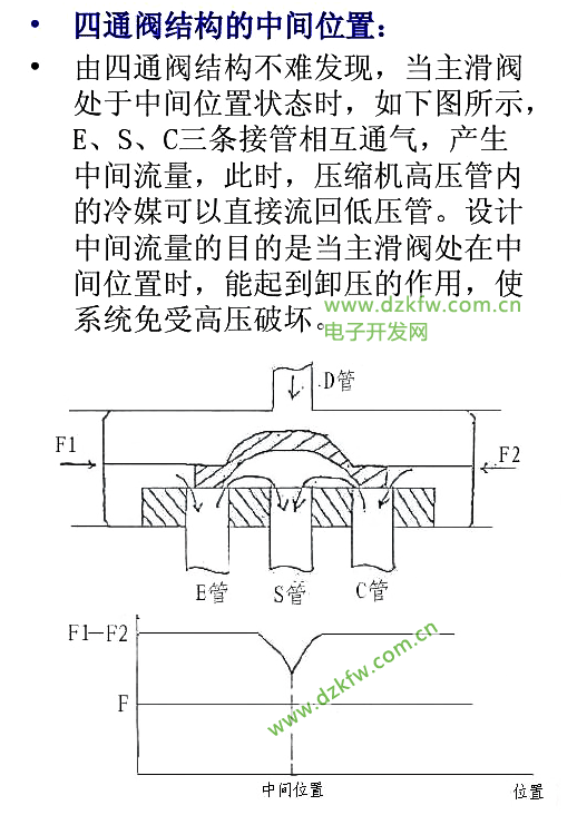 四通換向的基本條件是活塞兩端的壓力差(F1—F2)必須大于摩擦阻力f,否則,四通閥將 不會換向。換向所需的最低動作壓力差是靠系統流量來保證的。當左右活塞腔的壓力差大 于摩擦阻力f時,四通閥換向開始,當主滑閥運動到中間位置時,四通閥的E、S、C三條接 管相互導通,壓縮機排出的冷媒從四通閥D接管直接經E、C接管流向S接管(壓縮機回氣 口),使壓力差快速降低,形成瞬時串氣狀態(中間流量狀態)。此時,若壓縮機的排氣 流量遠大于四通閥的中間流量,便可以建立足夠大的換向壓力差而使四通閥換向到位;反 過來,若壓縮機的排氣量小于四通閥的中間流量,則四通閥換向所需的最低動作壓力差便 不能建立,即F1-F2<f,四通閥不能繼續換向而停在中間位置,形成串氣。