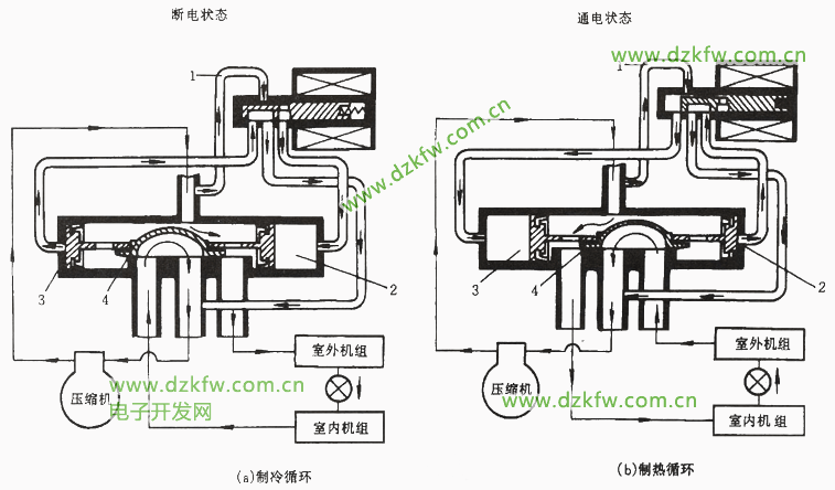 當電磁閥線圈處于通電狀態,如圖(b),先導滑閥在電磁線圈產生的磁力作用下克服壓縮彈簧的張力而右移,高壓氣體進入毛細管①后進入左端活塞腔,另一方面,右端活塞腔的氣體排出,由于活塞兩端存在壓差,活塞及主滑閥右移,使排氣管(S管)與室內機接管(E管)相通,另兩根接管相通,形成制熱循環。