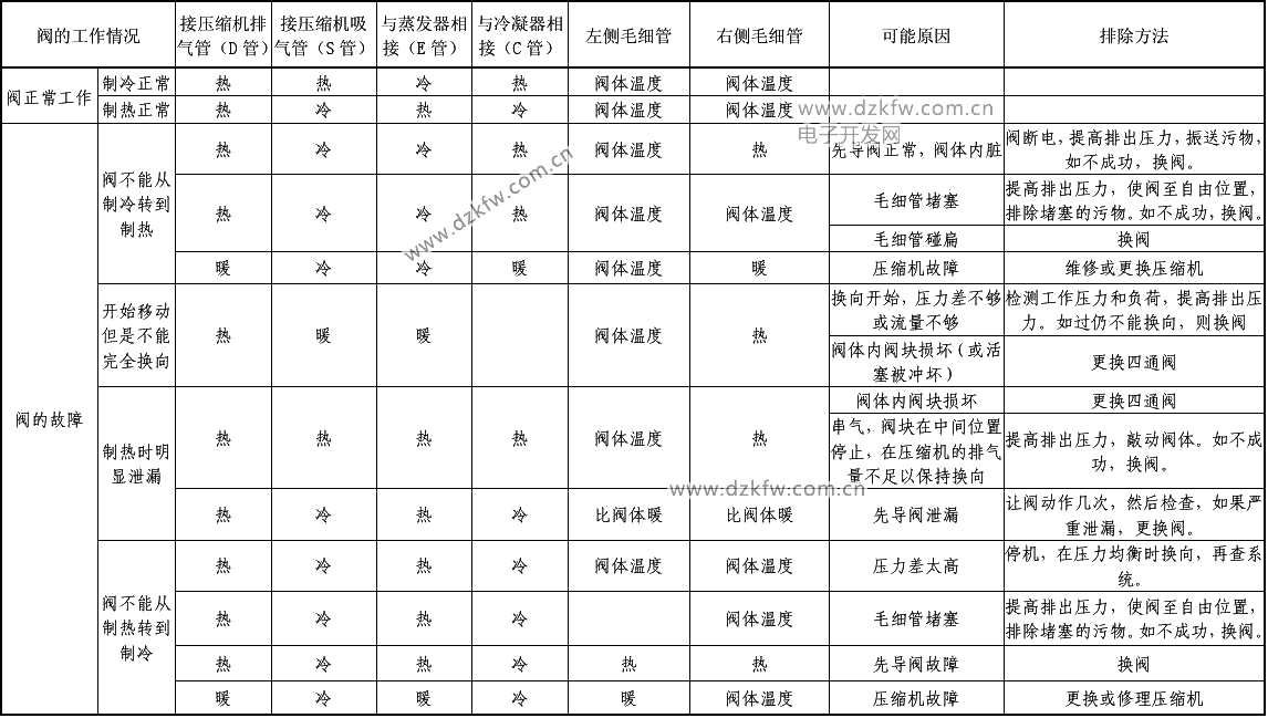 四通閥常見故障有串氣、換向不良、泄漏等幾種。根據過去的故障事例,匯總如下表,供維修時參考: