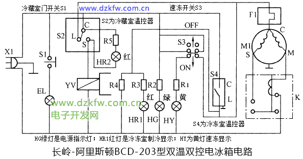 下圖所示的是長嶺-阿里斯頓BCD-203型雙溫雙控電冰箱電路。S2為冷藏室溫控器;S4為冷凍室溫控器;EL為照明燈,安裝在冷藏室的頂部,由冷藏室門開關S1控制;HY為黃燈速凍顯示,由速凍開關S3控制;HG綠燈是電源指示燈;HR1紅燈是冷凍室制冷顯示,S4或S3接通時該燈亮,HR2紅燈是冷蔵室制冷顯示,由S2控制;K是電流起動繼電器;YV為電磁閥;M為壓縮機電動機。