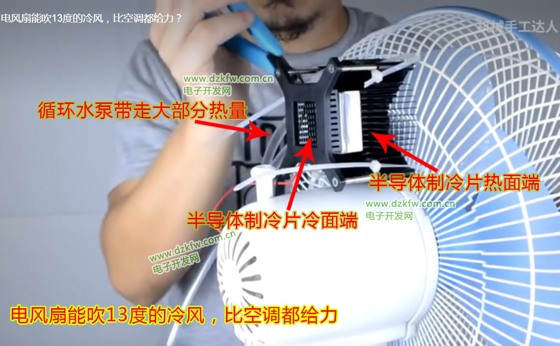 半導體制冷器和電風扇組裝成的可以吹冷風的空調風扇: