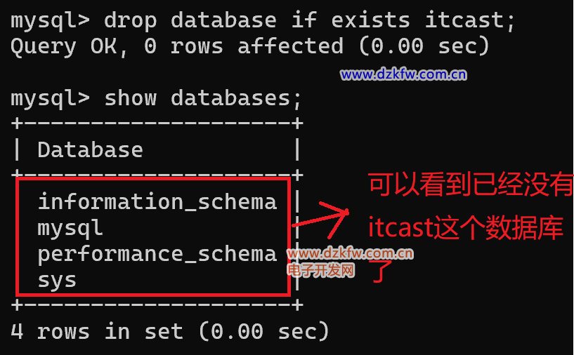 drop database [ if exists ] 數(shù)據(jù)庫名 ; /*如果刪除一個(gè)不存在的數(shù)據(jù)庫,將會(huì)報(bào)錯(cuò)。 此時(shí),可以加上參數(shù) if exists ,如果數(shù)據(jù)庫存在,再 執(zhí)行刪除,否則不執(zhí)行刪除。*/