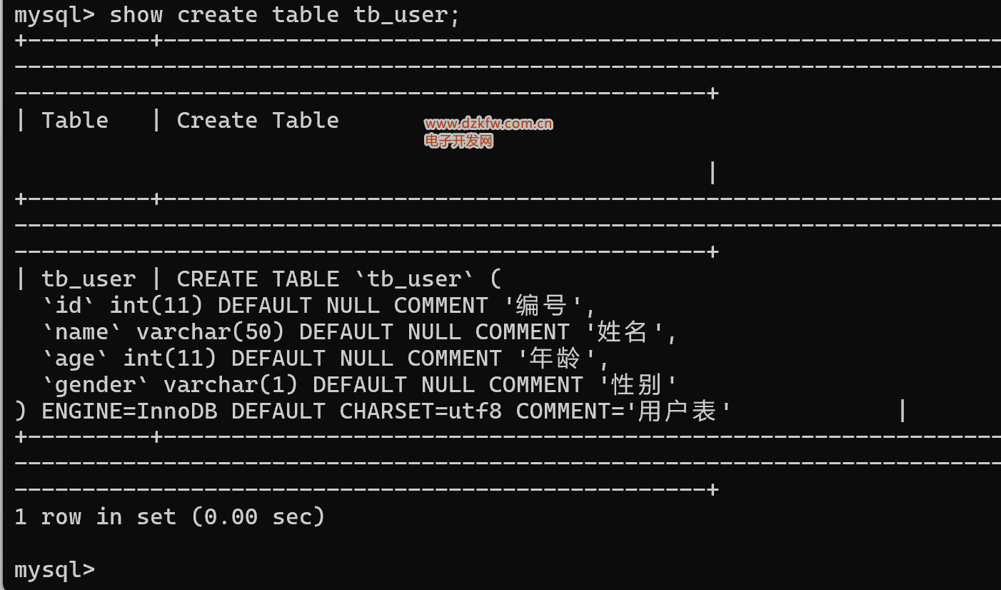 create table tb_user( id int comment '編號(hào)', name varchar(50) comment '姓名', age int comment '年齡', gender varchar(1) comment '性別' ) comment '用戶表';