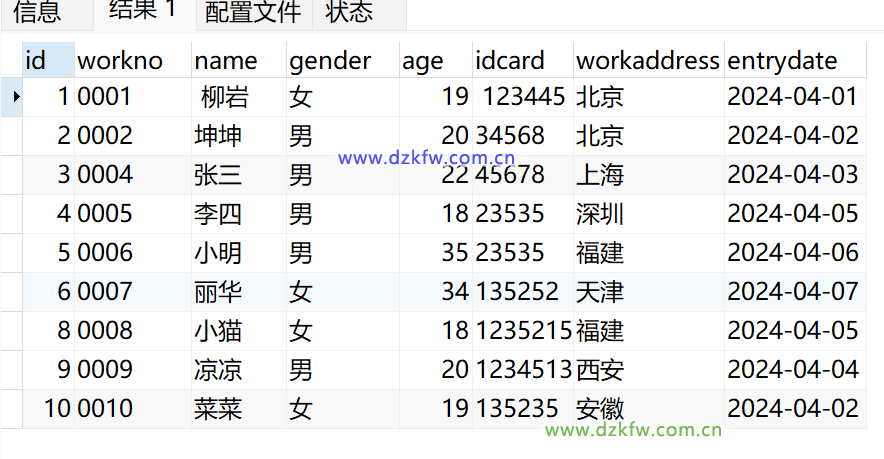 -- 查看所有數(shù)據(jù)庫 show databases; -- 創(chuàng)建itcast數(shù)據(jù)庫 create database if not exists itcast; -- 使用當(dāng)前數(shù)據(jù)庫 use itcast; -- 創(chuàng)建員工表 create table emp( id int comment '編號(hào)', workno varchar(10) comment '工號(hào)', name varchar(10) comment '姓名', gender char(1) comment '性別', age tinyint unsigned comment '年齡', idcard char(18) comment '身份證號(hào)', workaddress varchar(50) comment '工作地址', entrydate date comment '入職時(shí)間' )comment '員工表'; -- 展示所創(chuàng)建的表信息 desc emp; -- 加入表中成員 INSERT INTO `emp` (`id`, `workno`, `name`, `gender`, `age`, `idcard`, `workaddress`, `entrydate`) VALUES (1, '0001', ' 柳巖', '女', 19, ' 123445', '北京', '2024-04-01'); INSERT INTO `emp` (`id`, `workno`, `name`, `gender`, `age`, `idcard`, `workaddress`, `entrydate`) VALUES (2, '0002', '坤坤', '男', 20, '34568', '北京', '2024-04-02'); INSERT INTO `emp` (`id`, `workno`, `name`, `gender`, `age`, `idcard`, `workaddress`, `entrydate`) VALUES (3, '0004', '張三', '男', 22, '45678', '上海', '2024-04-03'); INSERT INTO `emp` (`id`, `workno`, `name`, `gender`, `age`, `idcard`, `workaddress`, `entrydate`) VALUES (4, '0005', '李四', '男', 18, '23535', '深圳', '2024-04-05'); INSERT INTO `emp` (`id`, `workno`, `name`, `gender`, `age`, `idcard`, `workaddress`, `entrydate`) VALUES (5, '0006', '小明', '男', 35, '23535', '福建', '2024-04-06'); INSERT INTO `emp` (`id`, `workno`, `name`, `gender`, `age`, `idcard`, `workaddress`, `entrydate`) VALUES (6, '0007', '麗華', '女', 34, '135252', '天津', '2024-04-07'); INSERT INTO `emp` (`id`, `workno`, `name`, `gender`, `age`, `idcard`, `workaddress`, `entrydate`) VALUES (8, '0008', '小貓', '女', 18, '1235215', '福建', '2024-04-05'); INSERT INTO `emp` (`id`, `workno`, `name`, `gender`, `age`, `idcard`, `workaddress`, `entrydate`) VALUES (9, '0009', '涼涼', '男', 20, '12345135', '西安', '2024-04-04'); INSERT INTO `emp` (`id`, `workno`, `name`, `gender`, `age`, `idcard`, `workaddress`, `entrydate`) VALUES (10, '0010', '菜菜', '女', 19, '135235', '安徽', '2024-04-02'); -- 這里先用來查看所有表中信息,后續(xù)會(huì)講到 select * from emp; /* 這里是不運(yùn)行的部分,僅作展示 -- 修改表中信息: update emp set name = '小王' where id = 1; update emp set entrydate = '2008-01-01'; -- 沒有條件where就是全部修改 -- 刪除表中數(shù)據(jù) delete from emp where gender = '女'; */