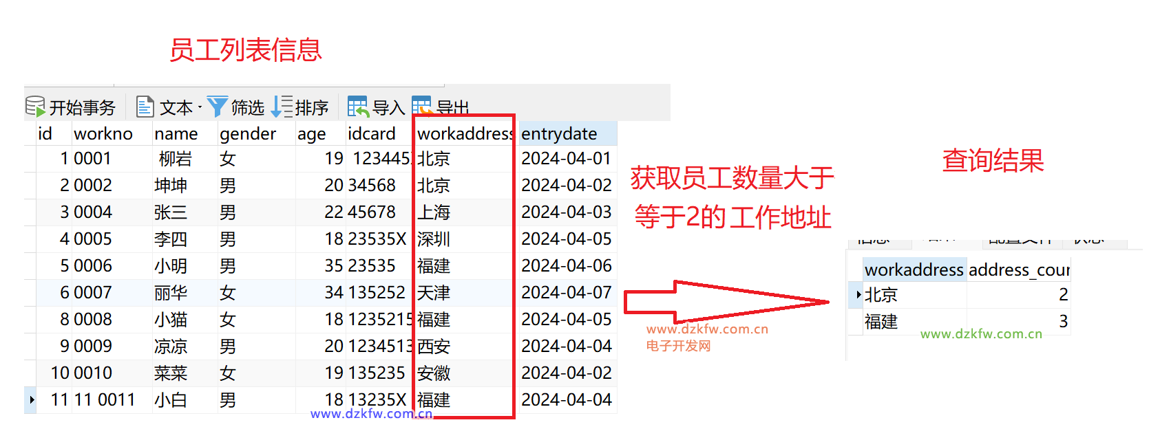 C. 查詢年齡小于45的員工 , 并根據(jù)工作地址分組 , 獲取員工數(shù)量大于等于2的工作地址: