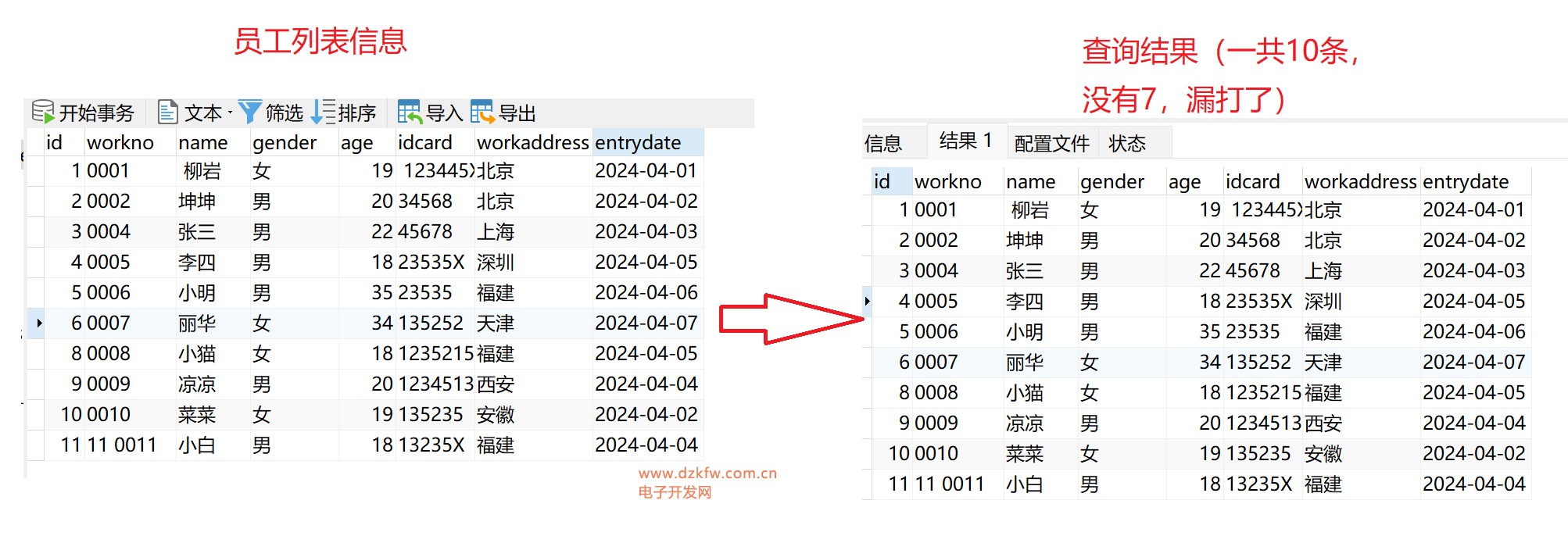 select id ,workno,name,gender,age,idcard,workaddress,entrydate from emp; -- 1 select * from emp; -- 2