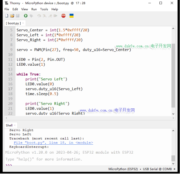 最后, 我們討論一下 MicroPython 開發(fā)嵌入式程序的特點。對于初學(xué)者需要注意三個方面的內(nèi)容。第一個就是程序主題大體上呈現(xiàn)設(shè)置與循環(huán)兩部分。在設(shè)置部分,往往需要 import 所需要的軟件包、 對程序軟件變量和硬件模塊進行初始化等然后程序進入一個由 for 或者 while 語句構(gòu)成的無限循環(huán)結(jié)構(gòu), 在這個結(jié)構(gòu)中周期的執(zhí)行一系列的指令, 完成控制的主要任務(wù)。第二部分就是需要理解程序中包含有一些與硬件相關(guān)的變量、對象等。它們需要不停的進行循環(huán)刷新和幅值,這些實時變量的值反映了單片機外部端口的電壓信號, 或者通訊數(shù)據(jù)等, 通過前面的循環(huán)結(jié)構(gòu)進行周期的讀取或者賦值。 最終形成對外部電路的控制。