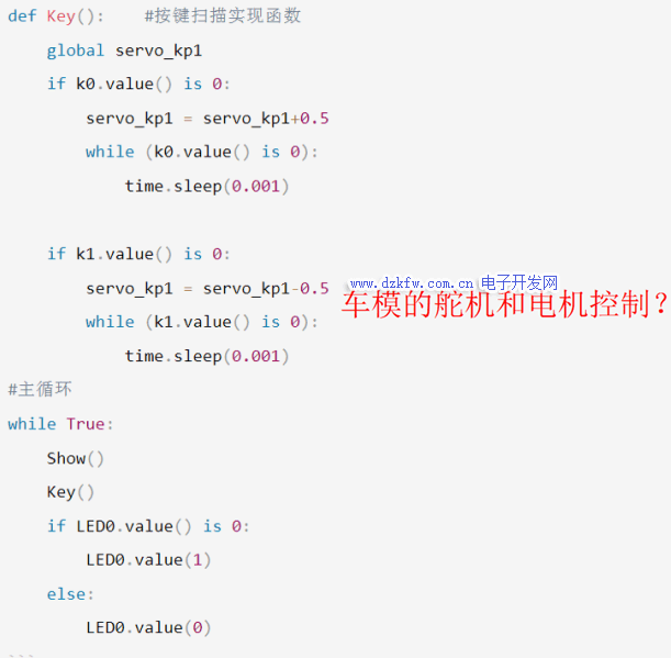這里以無線電軌智能車綜合測試程序為例, 來說明一下 MicroPython 程序的特點。對于初學(xué)者來看, 這個程序顯得有點復(fù)雜,但在整體上, 大家看到, 它分為前后兩部分。 前面部分屬于 Setup 初始化部分, 做了很多的硬件初始化, 也定義了一些函數(shù)。后面一部分,就是有 while 形成的 循環(huán)控制部分, 這些屬于軟件的后臺任務(wù)部分。在每一次循環(huán)中依次執(zhí)行 OLED 屏幕的刷新,按鍵的檢測處理,以及控制板上 LED 的閃爍, 用于顯示程序運行狀態(tài)。此時估計大家會有一個疑問, 車模運動中舵機和電機控制代碼在哪里執(zhí)行呢?