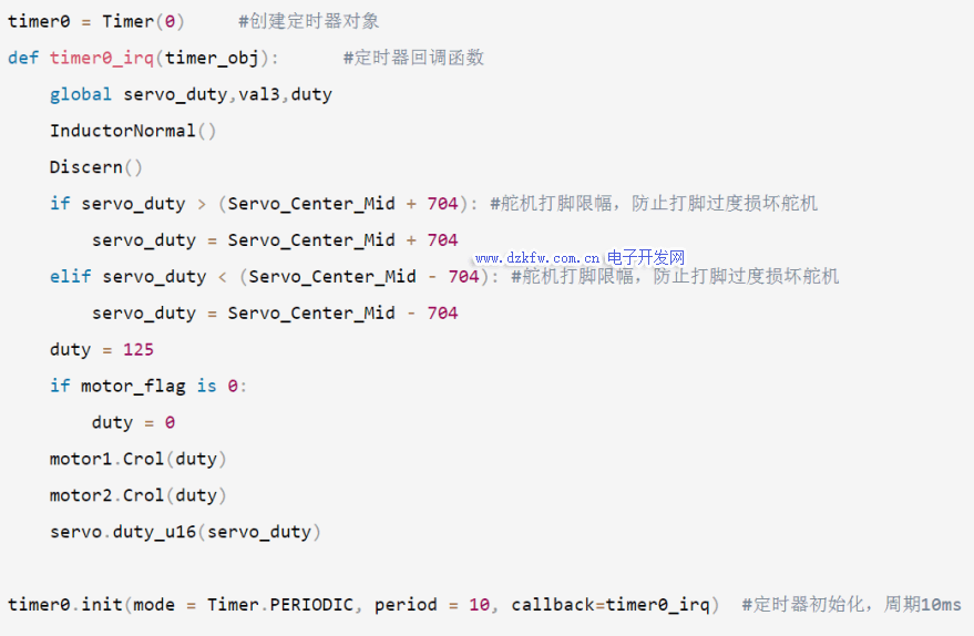 為了解決這個疑問, 大家看這個綜合演示程序的中間部分,在這里定義了 ESP32 硬件定時器對象, timer0,接下來定義了一個函數(shù), 用于定時器中斷函數(shù)后面是對定時器進行初始化,設(shè)置定時器工作模式為周期中斷模式,中斷周期為 10毫秒, 也就是100Hz 的重復(fù)頻率,第三個參數(shù)設(shè)置中斷服務(wù)程序。這個程序就是前面定義的 timer0 irq 函數(shù)。因此這個中斷程序就會在 Timer0 的中斷驅(qū)動下, 每隔精確的 10毫秒, 就被執(zhí)行一次。 中斷程序?qū)儆谇度胧杰浖那芭_任務(wù)。 中斷程序定義了中斷任務(wù)這些是需要用到的全局變量, 和程序中其它函數(shù)進行信息傳遞。讀取電磁場傳感器的交流電壓值判斷賽道的屬性計算舵機偏移量對舵機偏移量進行限幅下面就是設(shè)置電機運行速度和舵機偏移量。中間部分是用于控制電機是否運行的邏輯。之所以利用中斷周期進行車模控制, 主要是為了保證控制時間的精確和周期的穩(wěn)定。 這要比在 while 循環(huán)中執(zhí)行控制命令更加可靠。
